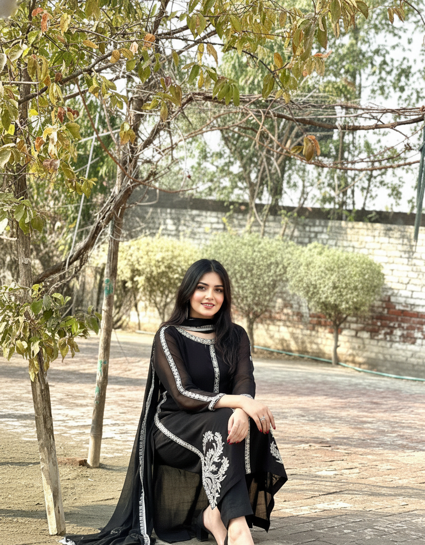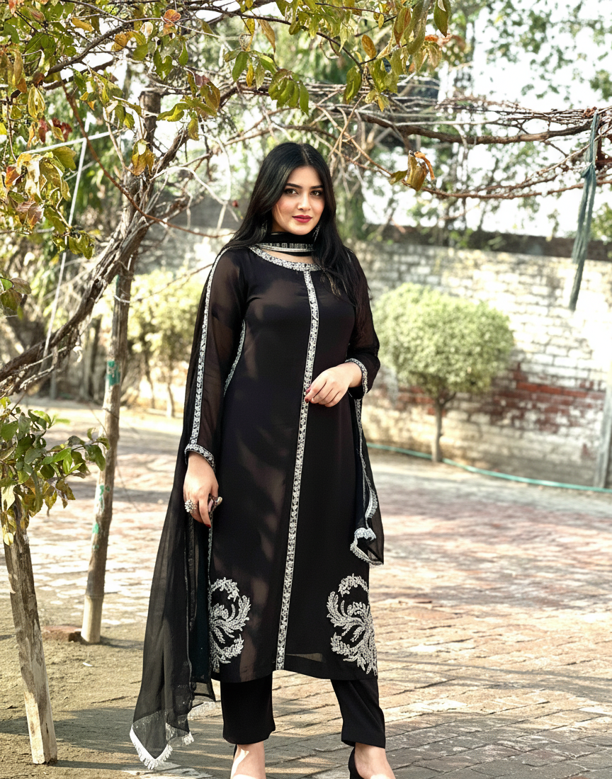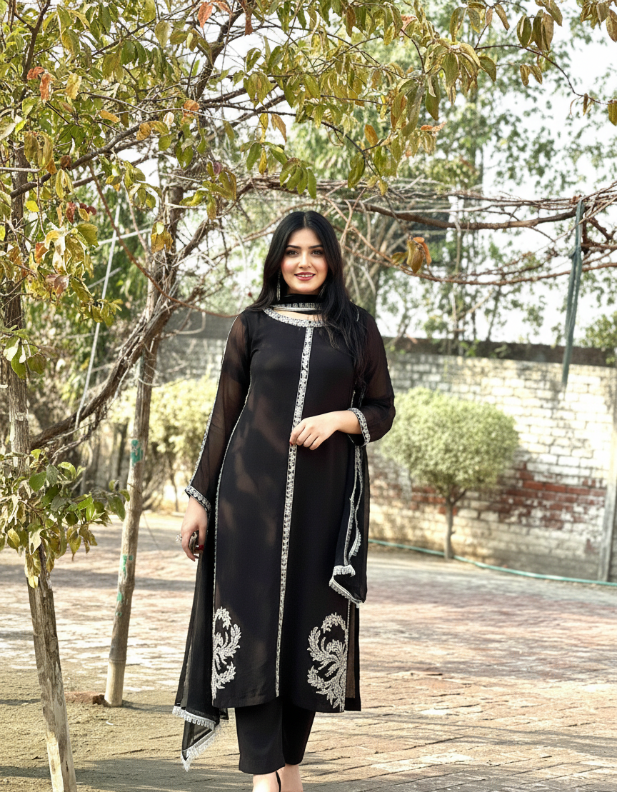 Add a refined charm to your wardrobe with this Premium Chiffon 3-piece suit, beautifully designed for elegance and comfort. The hand adda work on the shirt showcases traditional craftsmanship with a touch of luxury, making it perfect for festive gatherings and formal occasions. The chiffon dupatta flows gracefully, while the Raw Silk trouser ensures comfort and sophistication in every wear.