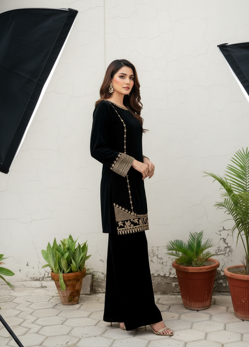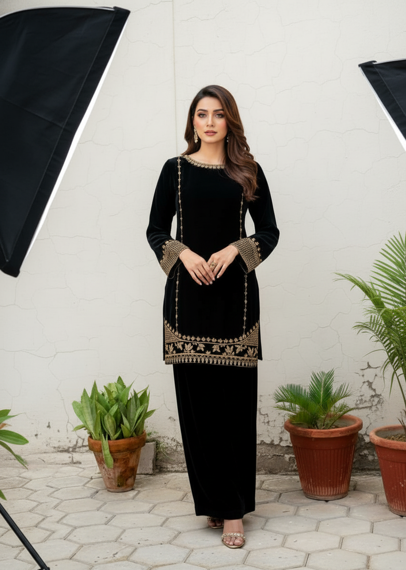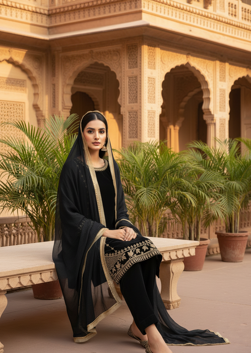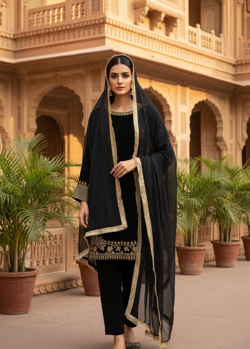 Step into refined elegance with this Graceful Velvet Outfit, a stunning fusion of luxury and tradition. Crafted from rich velvet fabric, it is beautifully adorned with adda work and intricate lace accents, creating a timelessly elegant look. The chiffon dupatta adds a touch of softness and grace, making it perfect for festive celebrations and formal gatherings.