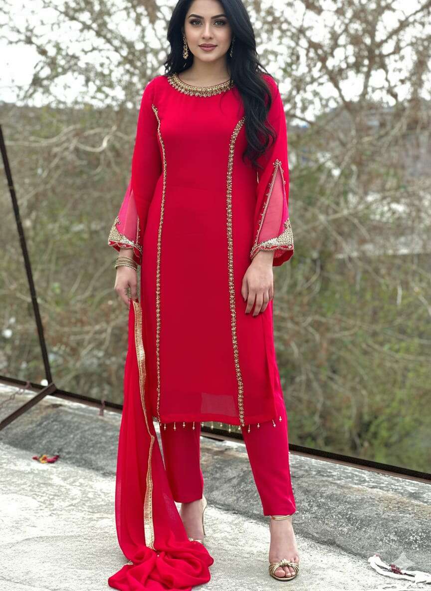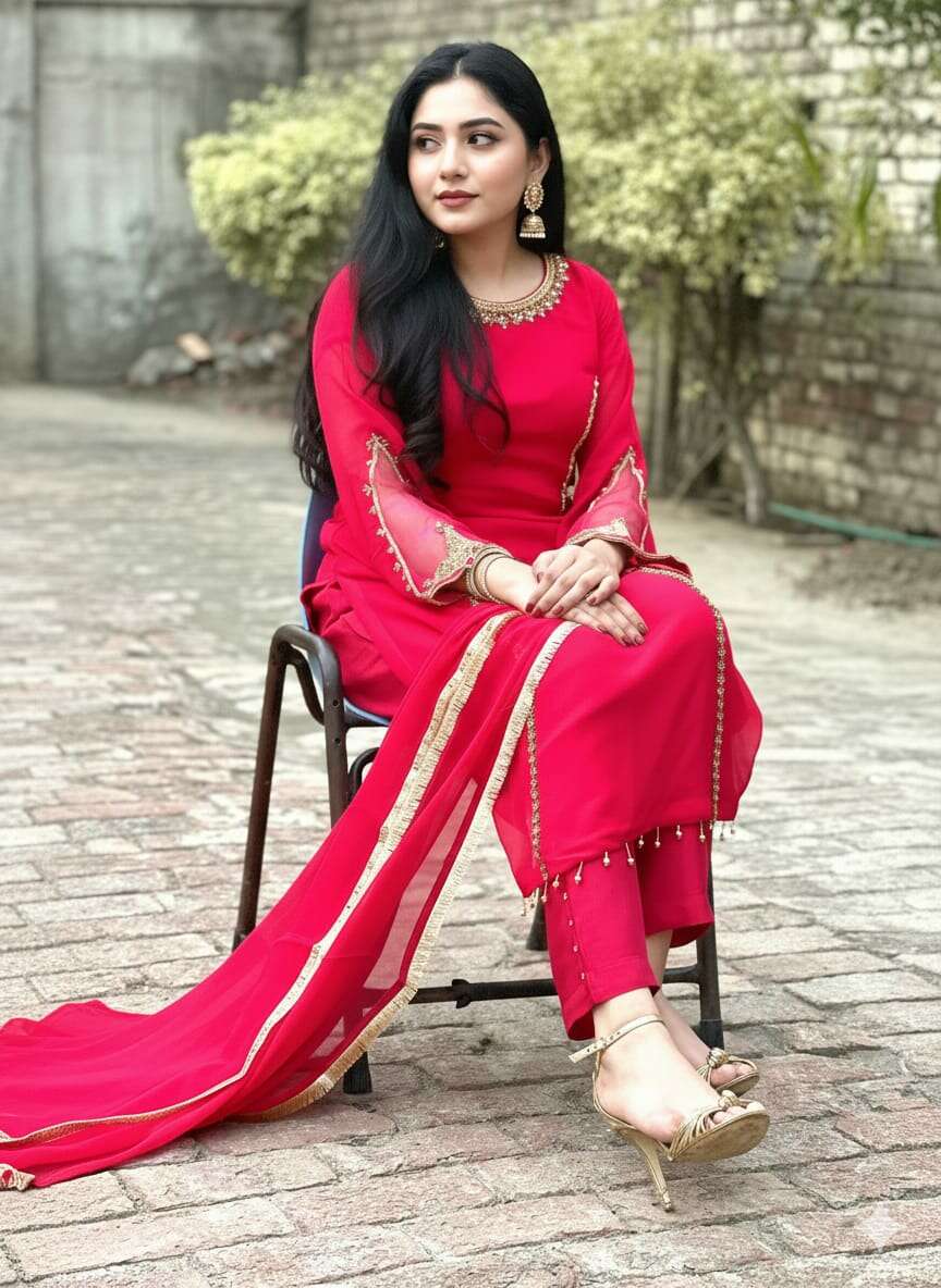 Add a touch of grace to your wardrobe with this Crimson Glow Chiffon 3-Piece Suit. Designed for sophistication and comfort, this outfit features hand adda work detailing on a flowy chiffon shirt, paired with a soft chiffon dupatta and a smooth Raw Silk trouser. Its vibrant crimson shade brings timeless elegance to festive gatherings or formal occasions.