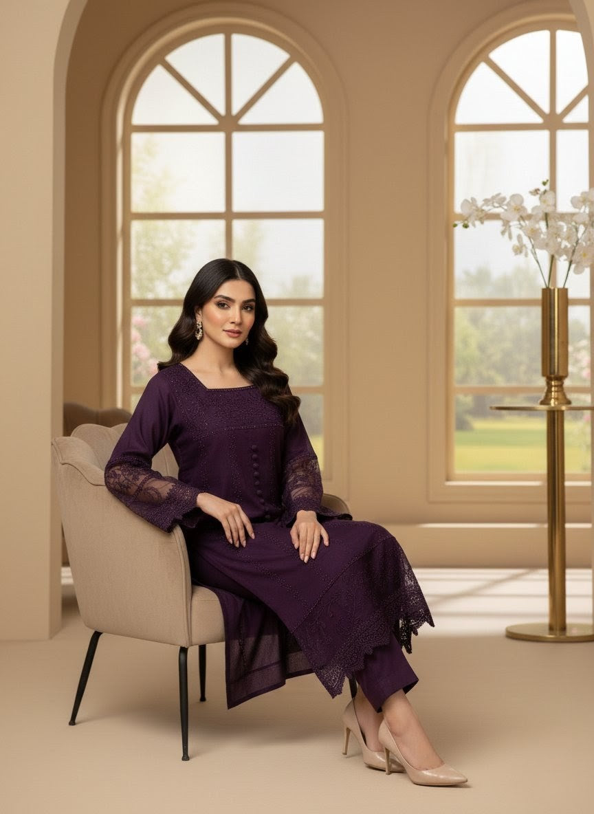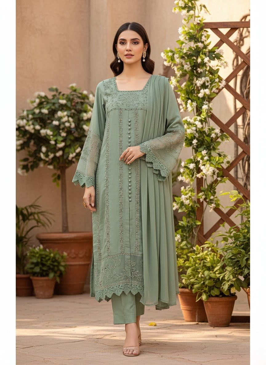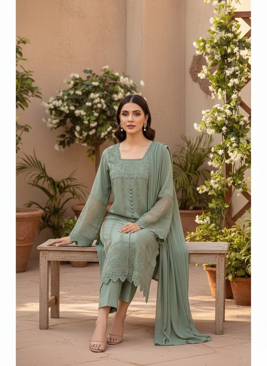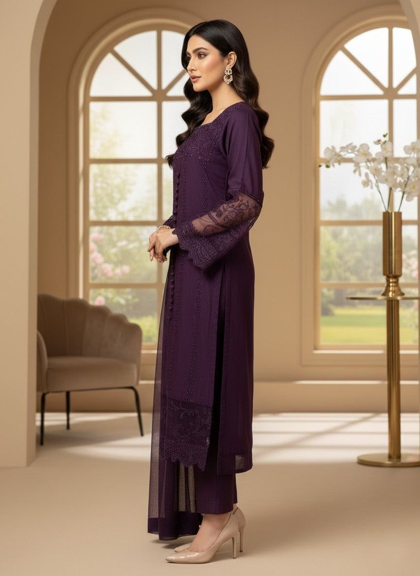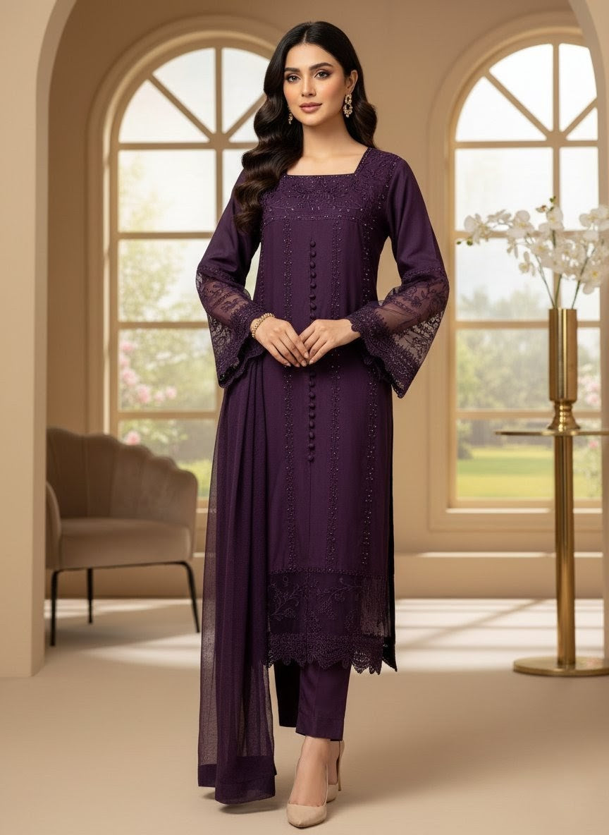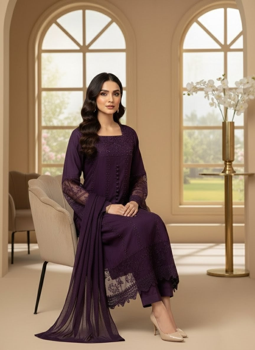 Radiate elegance with this Viscose 3-piece ensemble, beautifully designed to blend tradition and sophistication. The outfit features heavy embroidery with delicate lace on sleeves and borders, paired with a hand-embellished neckline that adds a touch of refined luxury. The chiffon dupatta and farshi shalwar complete the look with a graceful, flowing silhouette—perfect for festive and formal occasions.