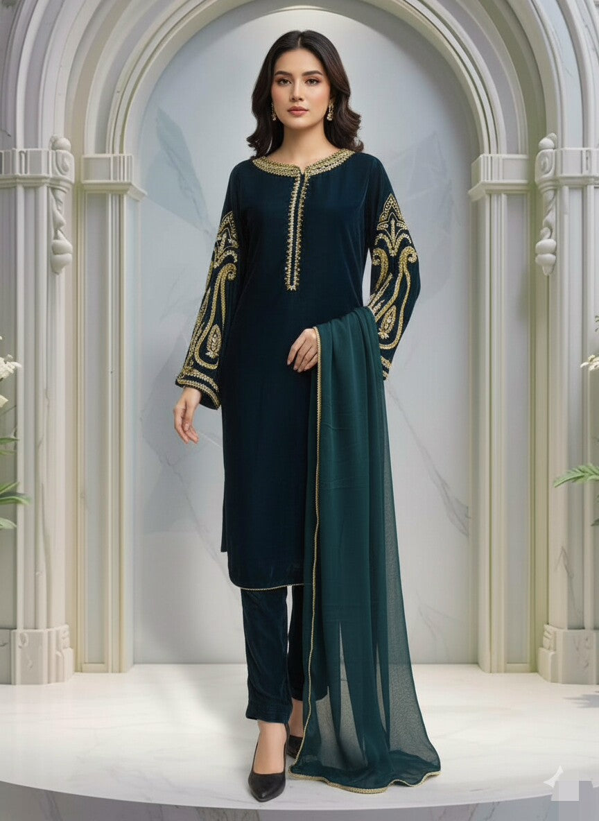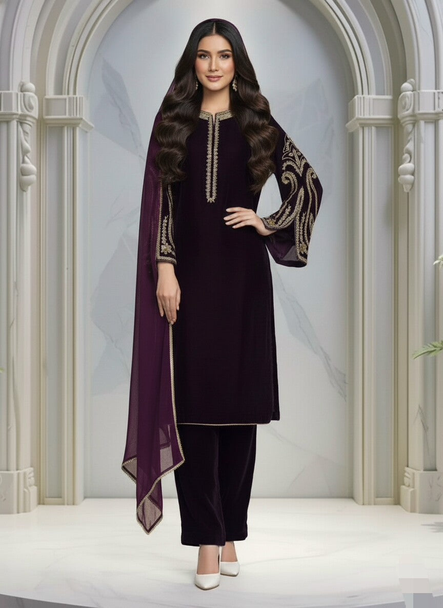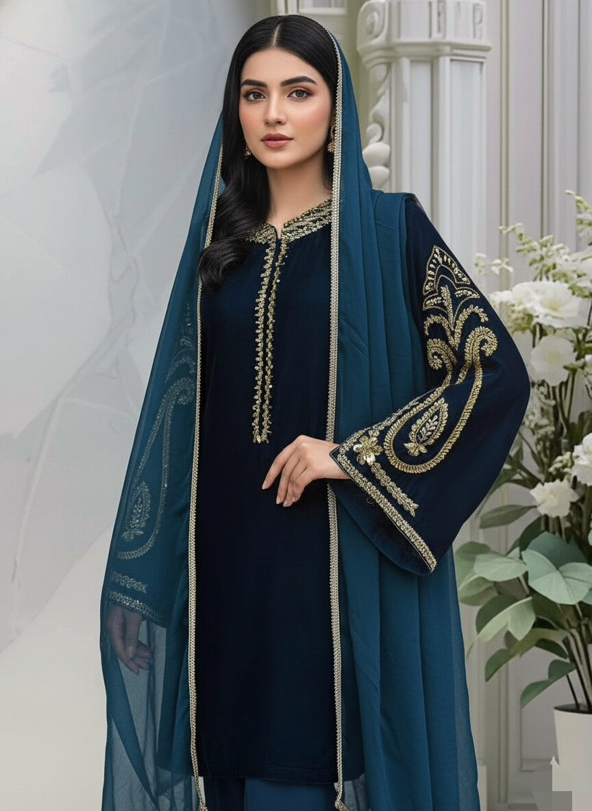 Radiate timeless charm in this Graceful Velvet Outfit, complemented by a Chiffon Dupatta that adds a touch of airy elegance. The ensemble is beautifully embellished with intricate adda work and refined lace accents, reflecting fine craftsmanship and luxurious detailing. Perfect for festive occasions, weddings, and evening gatherings, this outfit blends classic sophistication with contemporary grace for an effortlessly elegant look.